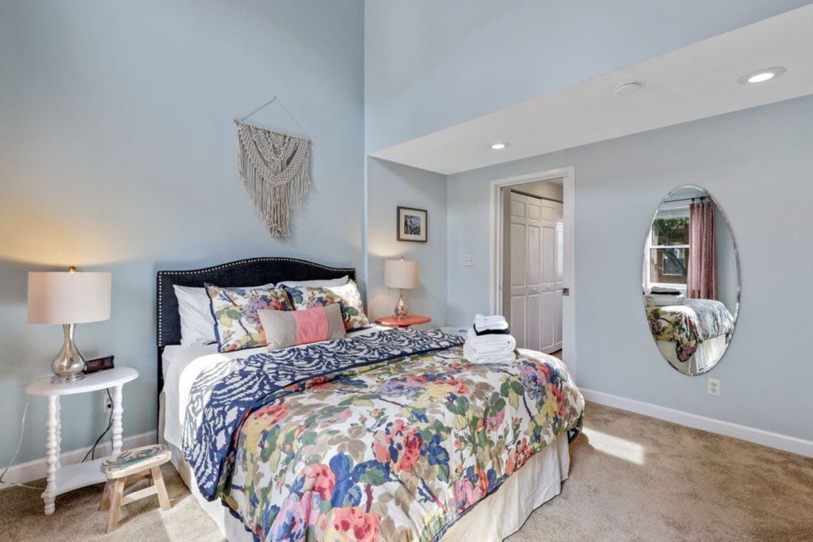 The bedrooms on the 2nd and 3rd floors each boast a plush queen bed, ensuring peaceful nights of sleep. Feel the pull of Baltimore’s charm as you immerse yourself in each room’s unique decor and color palettes, which reflect the serenity of a sleep sanctuary. The 3rd floor bedroom features a Smart TV and a desk with a monitor for work-from-home days.
