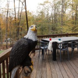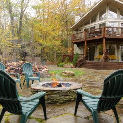 You have three private outdoor spaces to enjoy when you book the chalet. The largest is the private deck accessible by the second floor living room. It’s roomy enough for your whole group to sit outside and enjoy the outdoors, with a Weber Grill to ensure hamburgers and hot dogs for all. The second is a another deck, accessible through the lounge or front yard. And in front, you have your own fire-pit to relax and roast marshmallows after a busy day of exploring the Poconos!