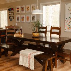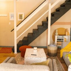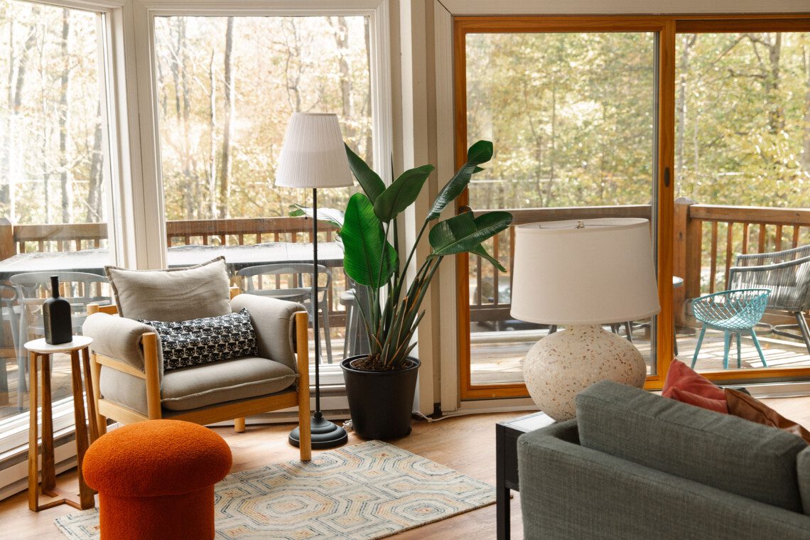 As you step into the chalet, you’ll be greeted by our cozy first-floor lounge with an Article couch and armchair, vintage Nintendo games, a record player, a 65″ Smart TV, and a tulip-shaped table for cards, snacks, puzzles, or family game night. Escape from reality and enjoy our lounge for moments of entertainment or quiet reflection.