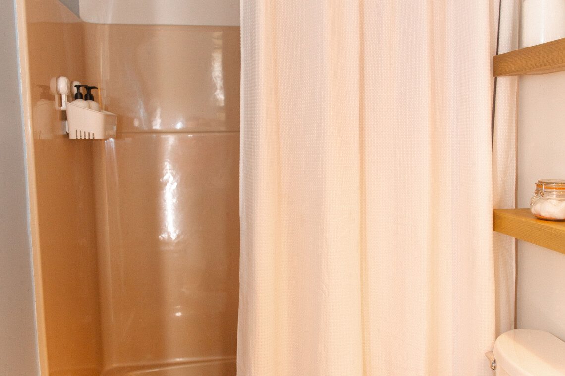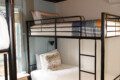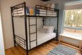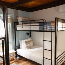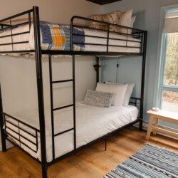 On the ground level, we offer two different bedrooms, one with a king-size bed and the third featuring two sets of twin bunk beds. A full-size bathroom with a tub and shower sits between the two bedrooms on the ground floor.