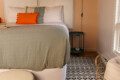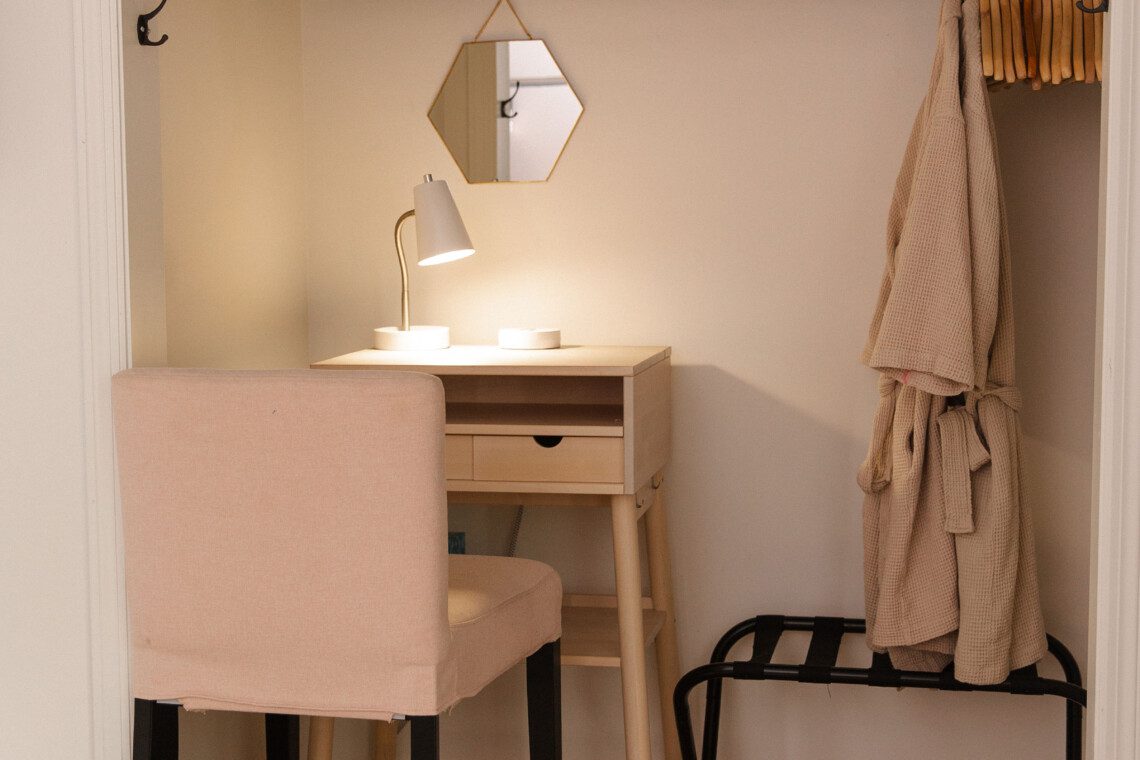 The primary bedroom upstairs on the second floor has a king-size bed and a convenient desk perfect for journaling about your experiences. The second-floor bathroom sits right between the primary bedroom and the kitchen.